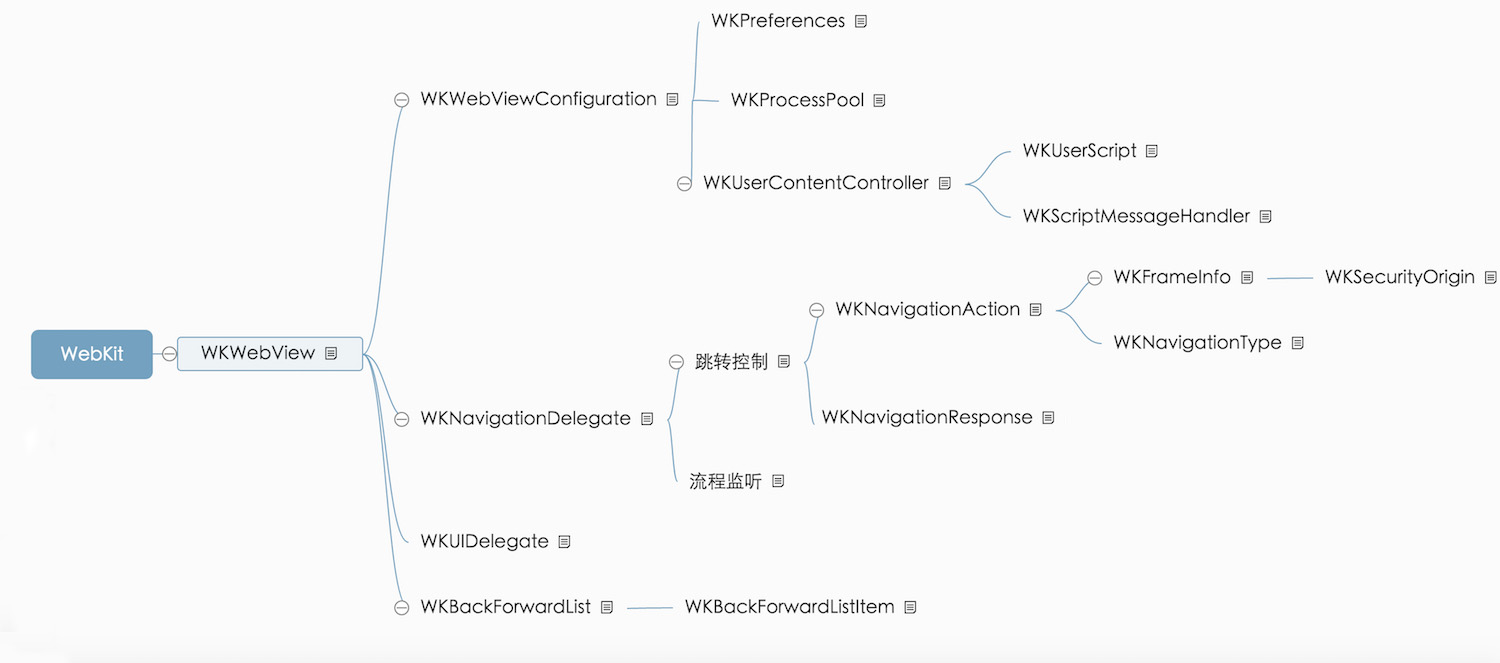 如上图所示,WebKit 框架中最核心的类应该属于 WKWebView 了,这个类专门用来渲染网页视图,其他类和协议都将基于它和服务于它。